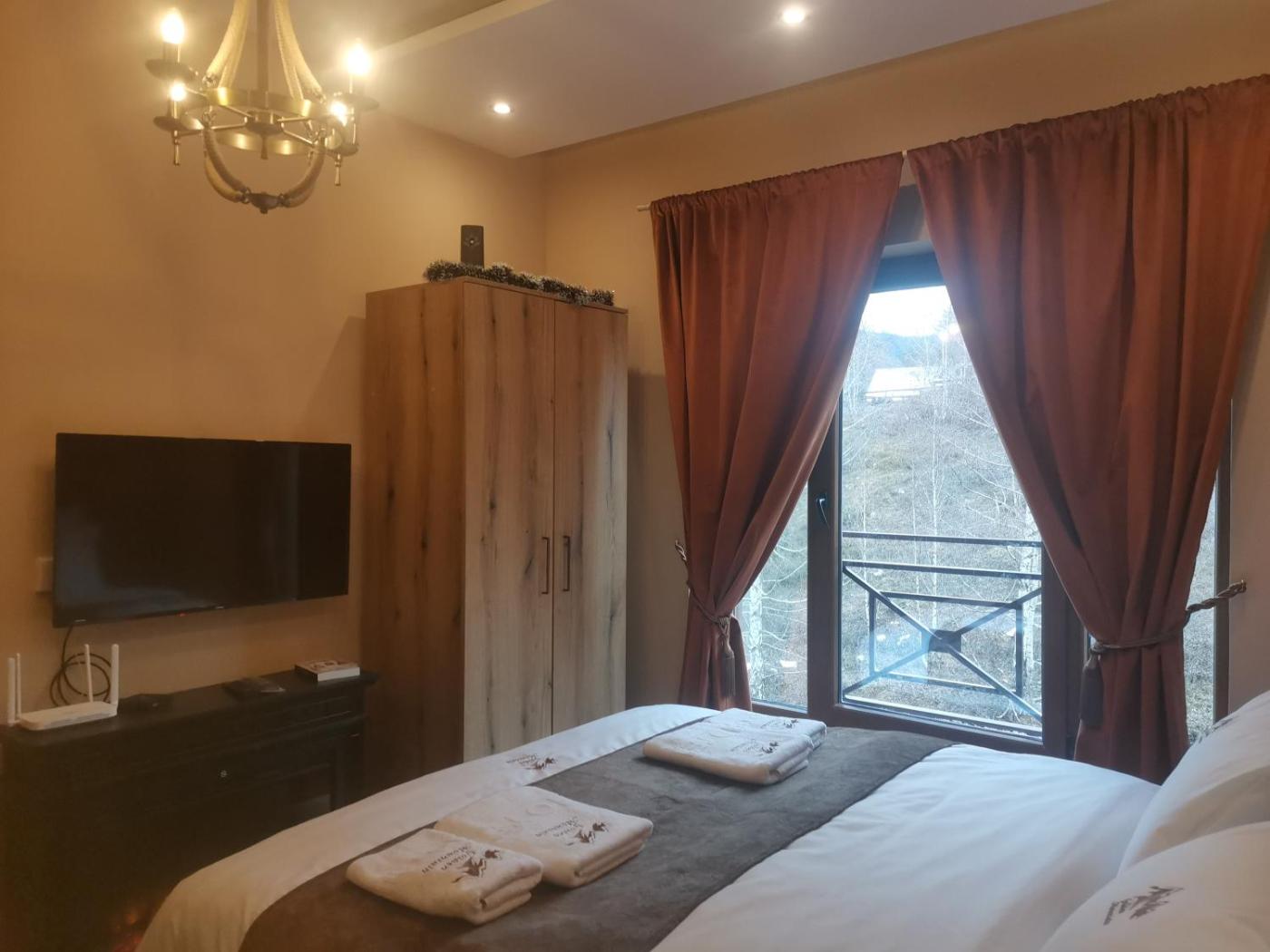 One-Bedroom Apartment. This luxurious apartment features a pool with a view, a sauna and a fireplace. Boasting a private entrance, this apartment comes with a kitchen, 1 bedroom and 1 bathroom with a shower and a hairdryer. In the kitchen, guests will find a stovetop, a refrigerator, kitchenware and a microwave. This apartment has a minibar, flat-screen TV with satellite channels, mountain views, as well as winechampagne for guests. The unit has 1 bed.