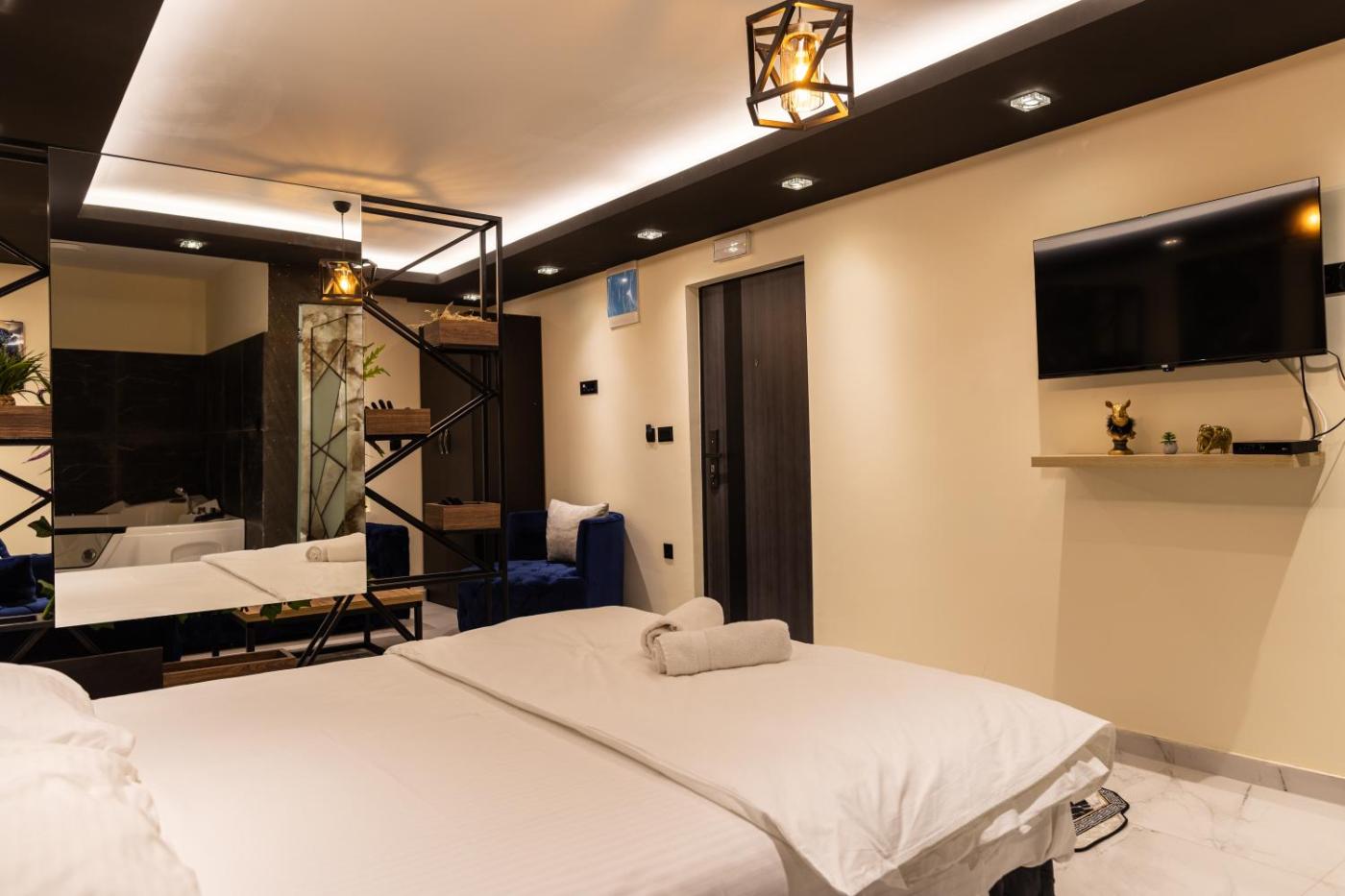 Superior King Room. The hot tub is the standout feature of this double room. Offering free toiletries, this double room includes a private bathroom with a bath, a shower and a hairdryer. The spacious air-conditioned double room offers a flat-screen TV with cable channels, a washing machine, a tea and coffee maker and a seating area. The unit has 1 bed. ;